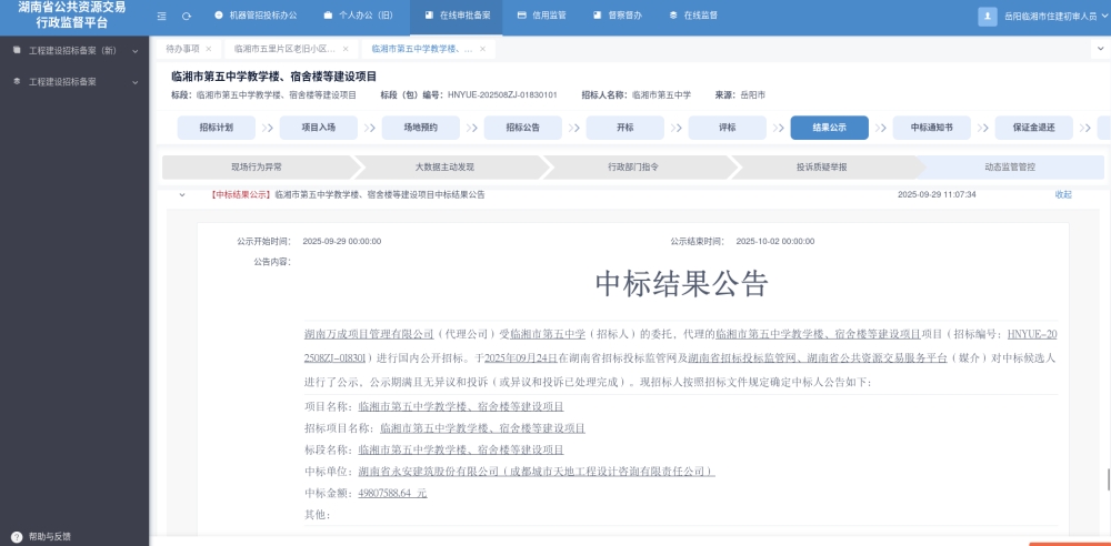 临湘市第五中学教学楼,宿舍楼等建设项目中标结果公告