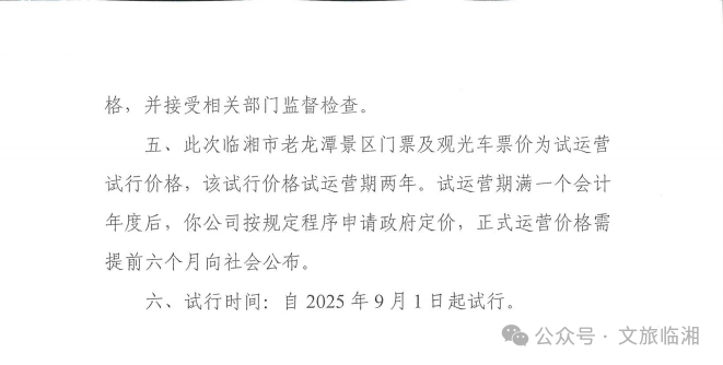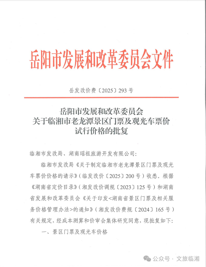 关于临湘市老龙潭景区门票及观光车票价试行价格的批复